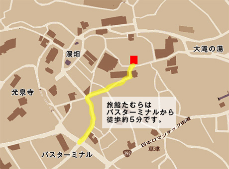 草津温泉の玄関口であるバスターミナルから旅館たむらまでは歩いて約5分です。まずは「湯畑」を目指して中央通り商店街をお進みください。バスターミナルから200mくらい歩いていただいた後、右手に温泉まんじゅう屋「本家ちちや」がございます。その角を右折していただき、道なりに2~3分お進みください。道には「地蔵の湯」へ向かう標札がございます。その道のつきあたりに地蔵の湯がございますので、その隣が旅館たむらでございます。
